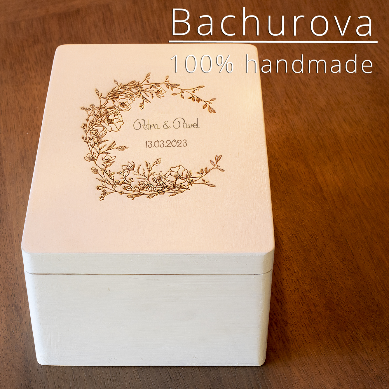 Bílá dřevěná krabice zdobená dekorem s gravírováním, doplněná jmény novomanželů a datem sňatku, podle Vašeho zadání. Získáte osobní stylové baleni na svatební skleničky, posléze na svatební vzpomínky, nebo místo kam umístit své poklady. Krabíčka je uvnitř vyložena dřevitou vlnou s okvětními lístky růží a levandule, rozdělana na dvě části dřevěnou přepážkou. Vkusně a prakticky uzpůsobeno pro uložení Vašich svatebních skleniček.