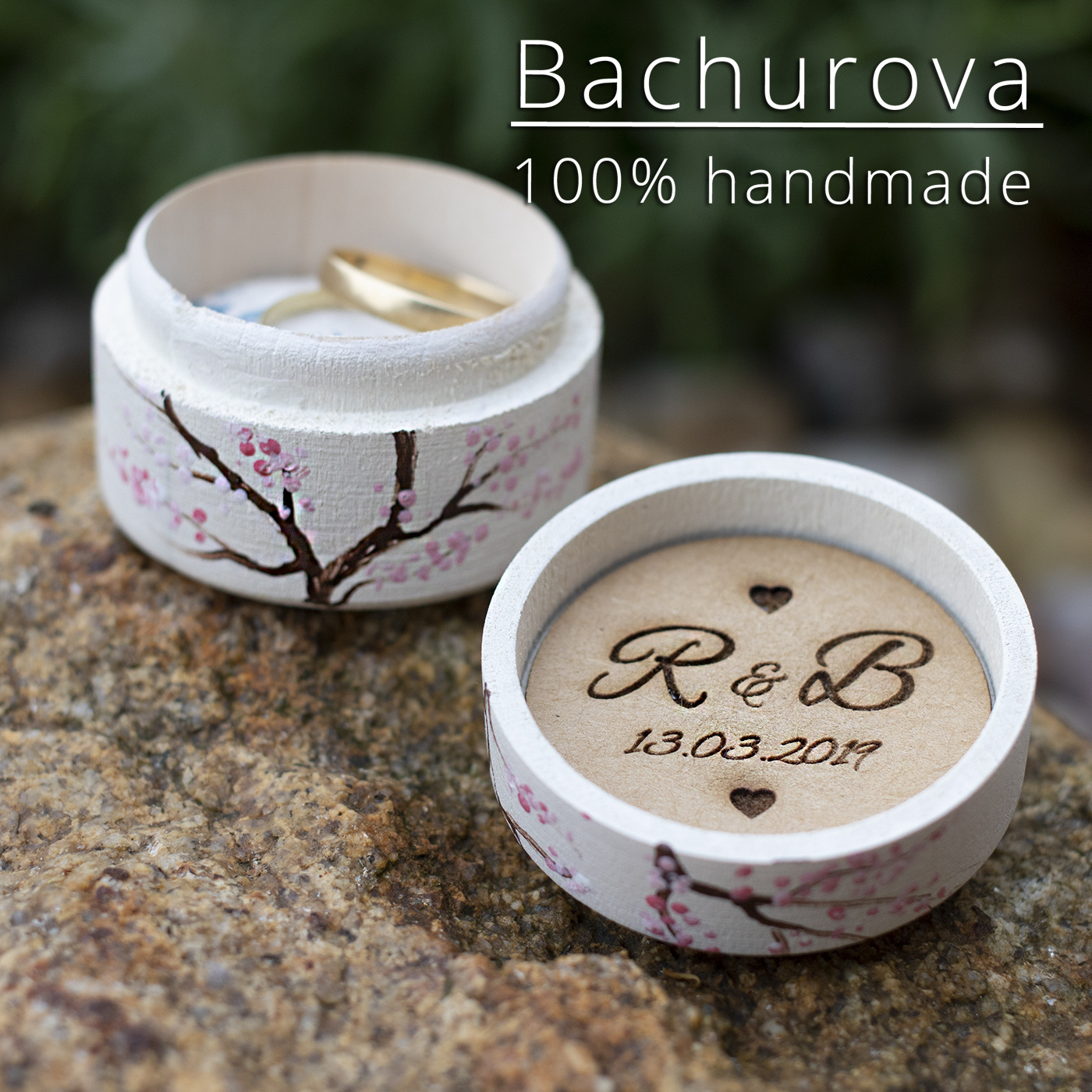 Krásná dřevěná krabička zdobená malbou a víčko nese jarní květy zalité v pryskyřici. Získáte stylové baleni na snubní prstýnky, nebo místo kam umístit své poklady. Krabíčka je uvnitř vyložena látkou.