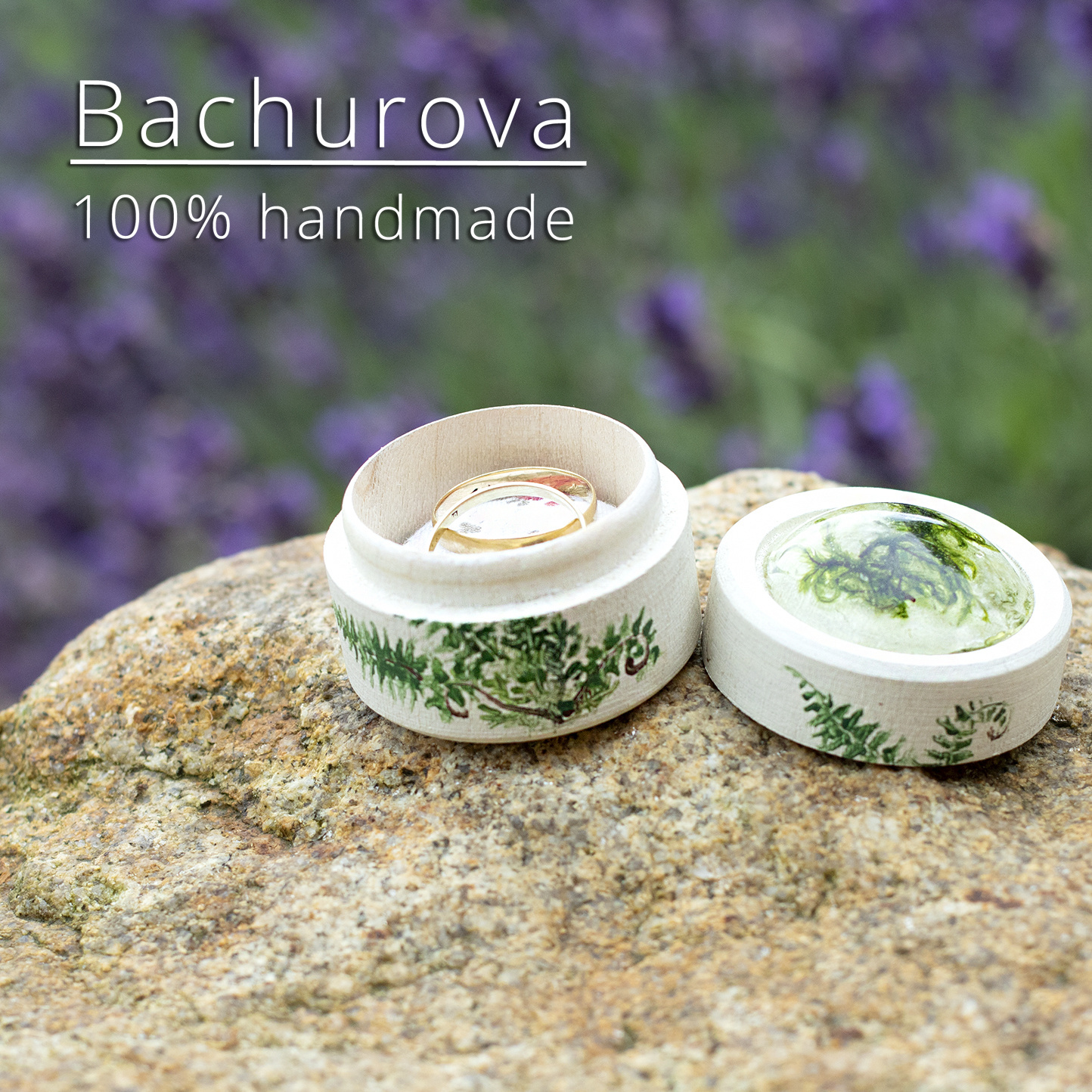 Krásná dřevěná krabička zdobená malbou ve víčku nejdete mech zalitý v pryskyřici. Získáte stylové baleni na snubní prstýnky, nebo místo kam umístit své poklady. Krabíčka je uvnitř vyložena látkou.