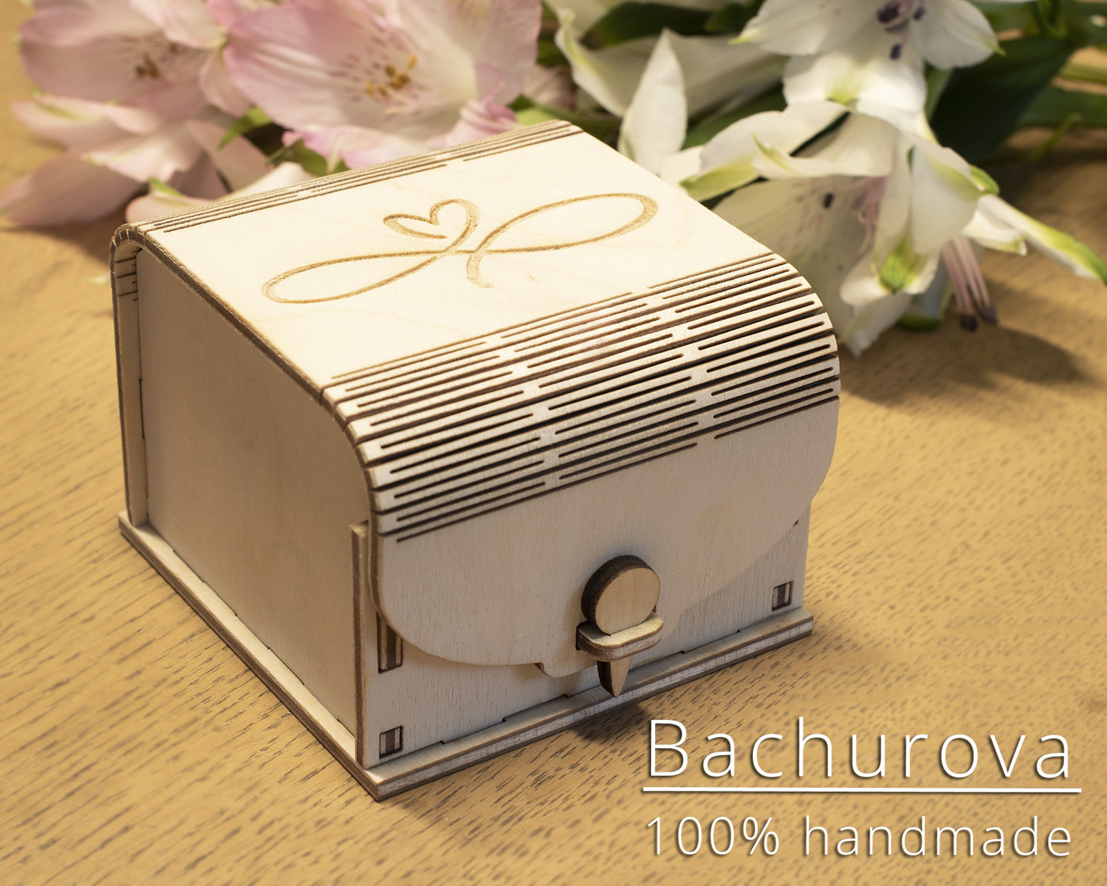 Krásná dřevěná krabička z 3 mm silné překližky, zdobená gravírováním s motivem srdíčka. Získáte osobní stylové baleni na snubní prstýnky, či malou dárkovou krabičku uvnitř vyloženou dřevitou "vlnou".