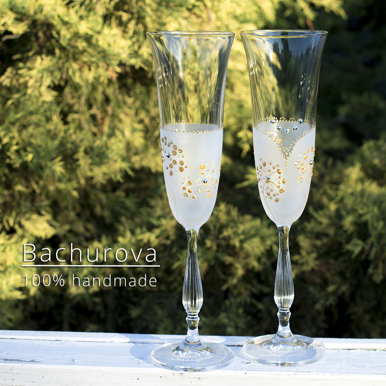Svatební skleničky. Romanticky zdobené pískováním a malováním za použití vypalovacích barev s motivem pampelišek .Laděno do zlaté barvy.