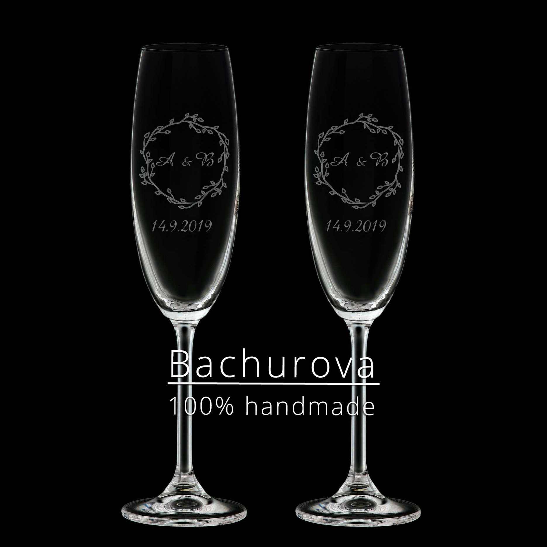 Svatební přípitkové skleničky, zdobené pískováním ( otryskáním skla proudem písku, přes předem připravenou šablonu). Pískované iniciály (nabo jména) snoubenců a datum sňatku je již započítán v ceně.
