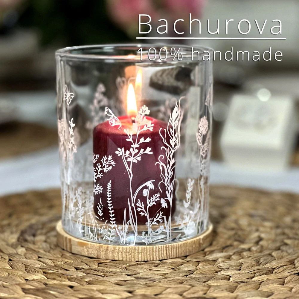 Velice luksusní skleněný svatební svícen s gravírováním Vámi zaslaných textů. Dekor je dobarvená rytina, která vytváří elegantní kresbu kterou probleskuje světlo svíčky (svíčka není součástí). Pod svícnem je podstavec z dřevěného masivu, po domluvě je možné doplnit o gravírování textu. Sklo je od českého výrobce v rozměrech 125 x 110 mm, opravdu masivní provedení. Svícen Vám zůstane jako krásná vzpomínka na Váš svatební den a dá se použít i k jiným příležitostem.
