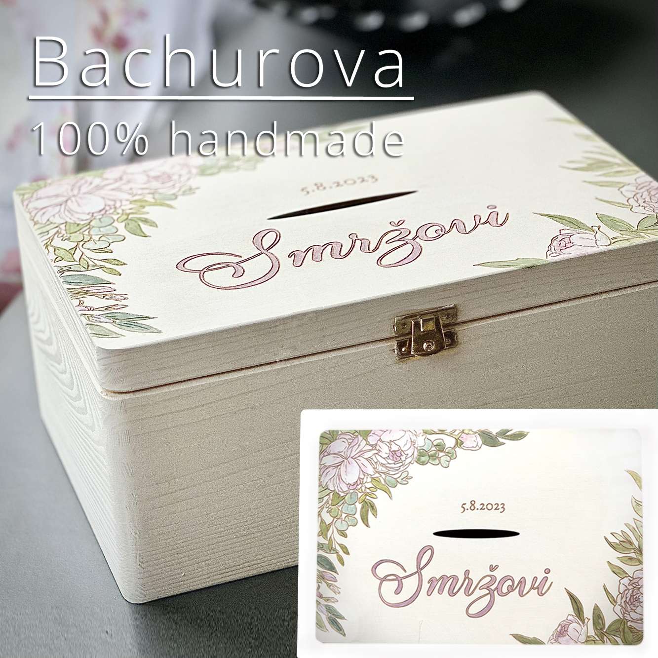 Bílá dřevěná truhla zdobená dekorem s gravírováním a malbou doplněná jmény novomanželů a datem sňatku, podle Vašeho zadání. Získáte osobní stylovou svatební dřevěnou truhlu pro krásný a praktický způsob, jak uložit peníze nebo blahopřání od hostů. Truhla je vyrobena z kvalitního dřeva a je zdobena elegantním designem. Truhla bude krásnou připomínkou vašeho velkého dne a bude vám sloužit po mnoho let na vaše vzpomínky ze svatby - fotky, blahopřání, oznámení...